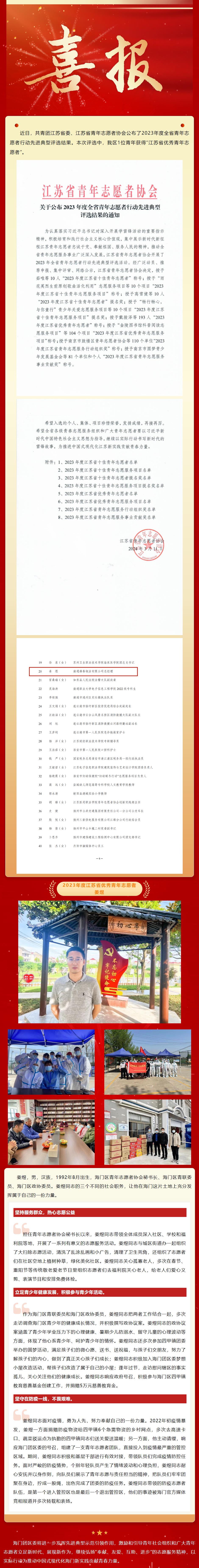 2024年3月,總經理姜煜榮獲“2023年度江蘇省優(yōu)秀青年志愿者”。